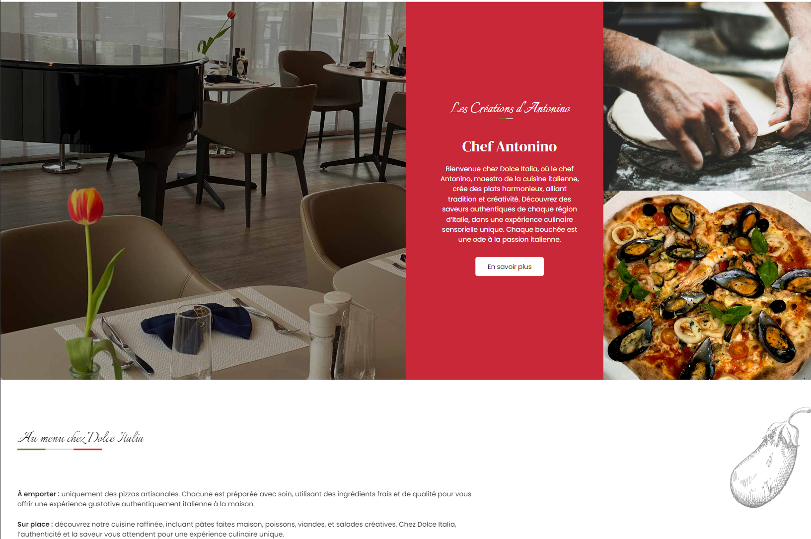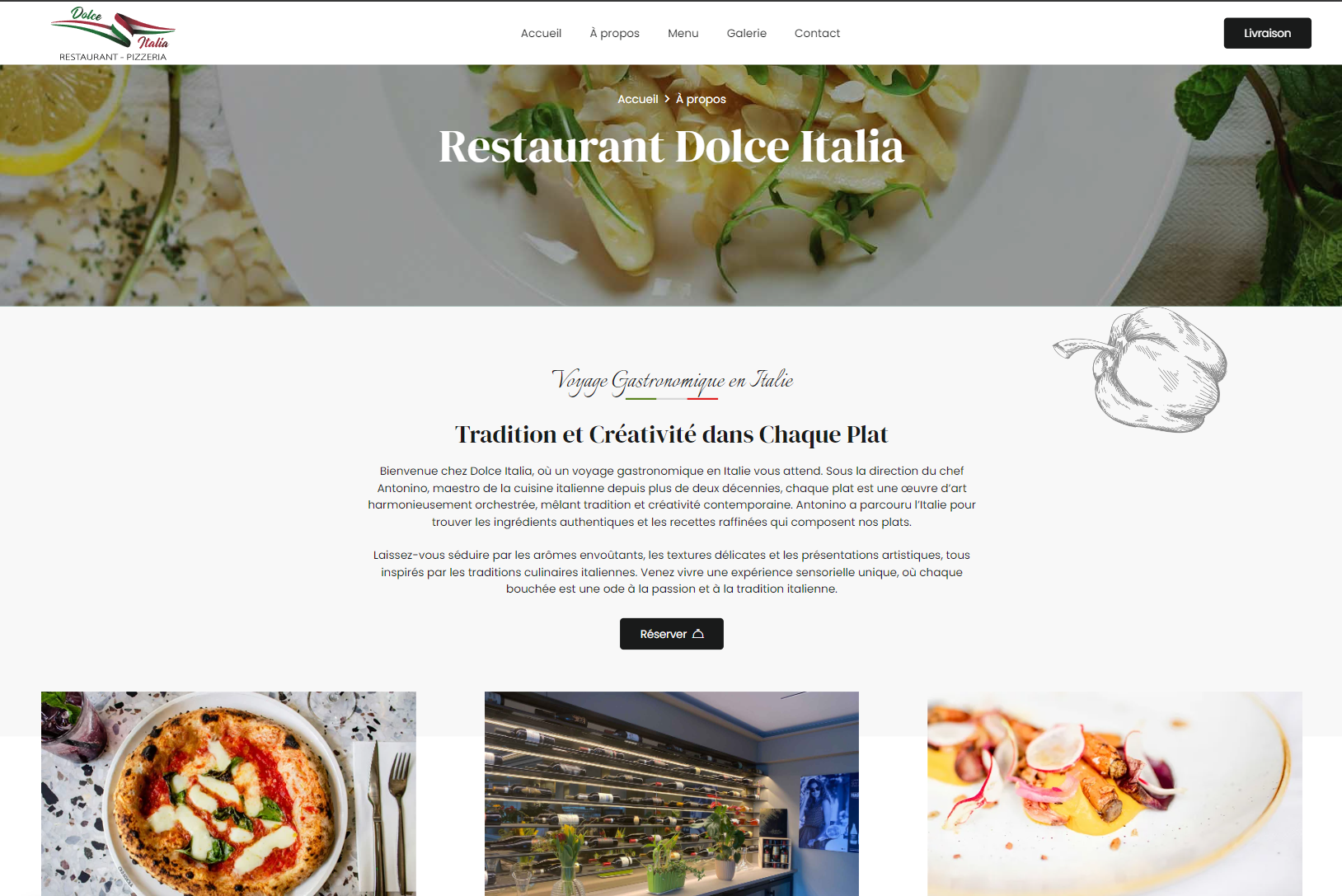 Le site Dolce Italia met en lumière la passion du restaurant pour la gastronomie italienne, en présentant un menu détaillé, des photos appétissantes des plats. Grâce à une navigation fluide et un design responsive, le site Dolce Italia offre une expérience utilisateur agréable, tant sur ordinateur que sur mobile. Nous avons veillé à ce que chaque visiteur puisse facilement accéder aux informations nécessaires et soit inspiré à vivre une expérience culinaire mémorable chez Dolce Italia.