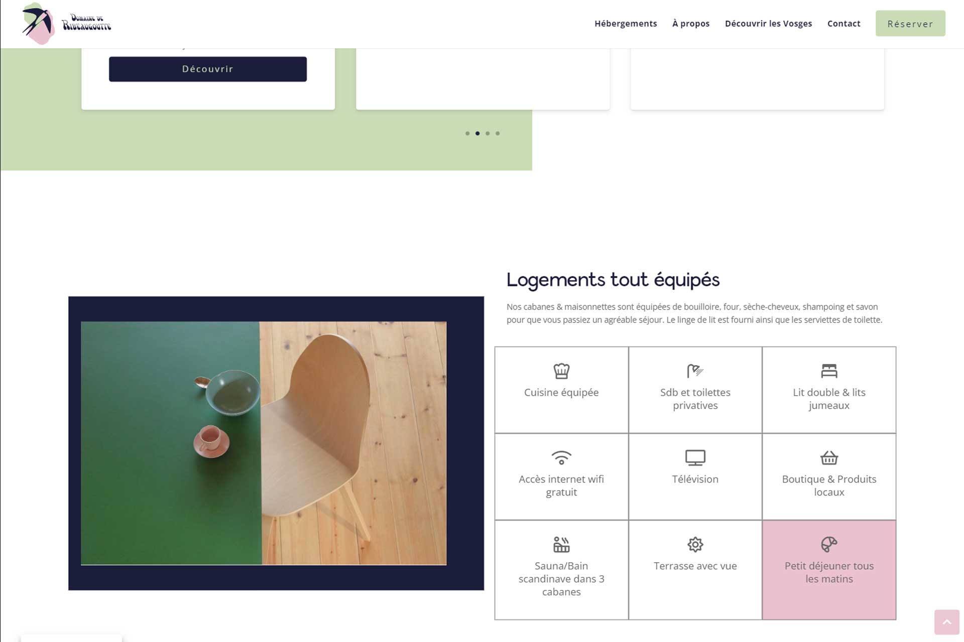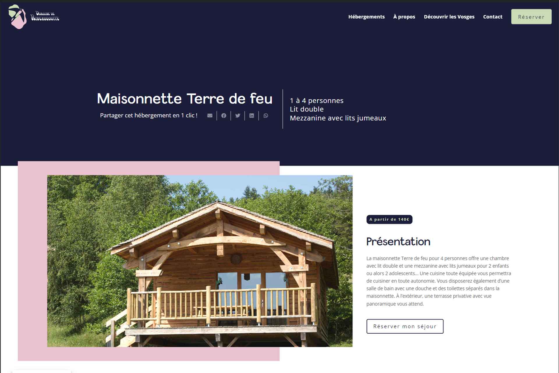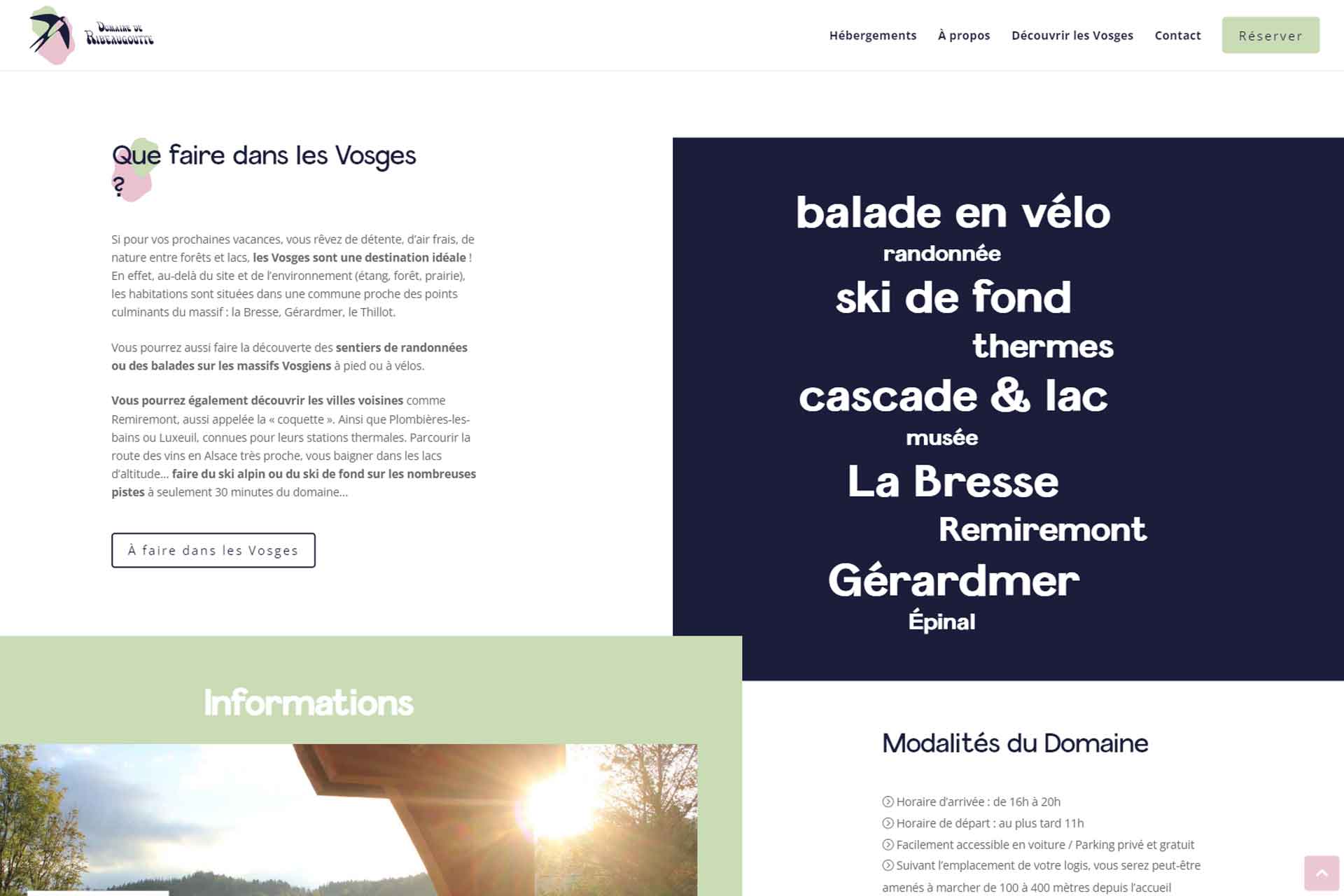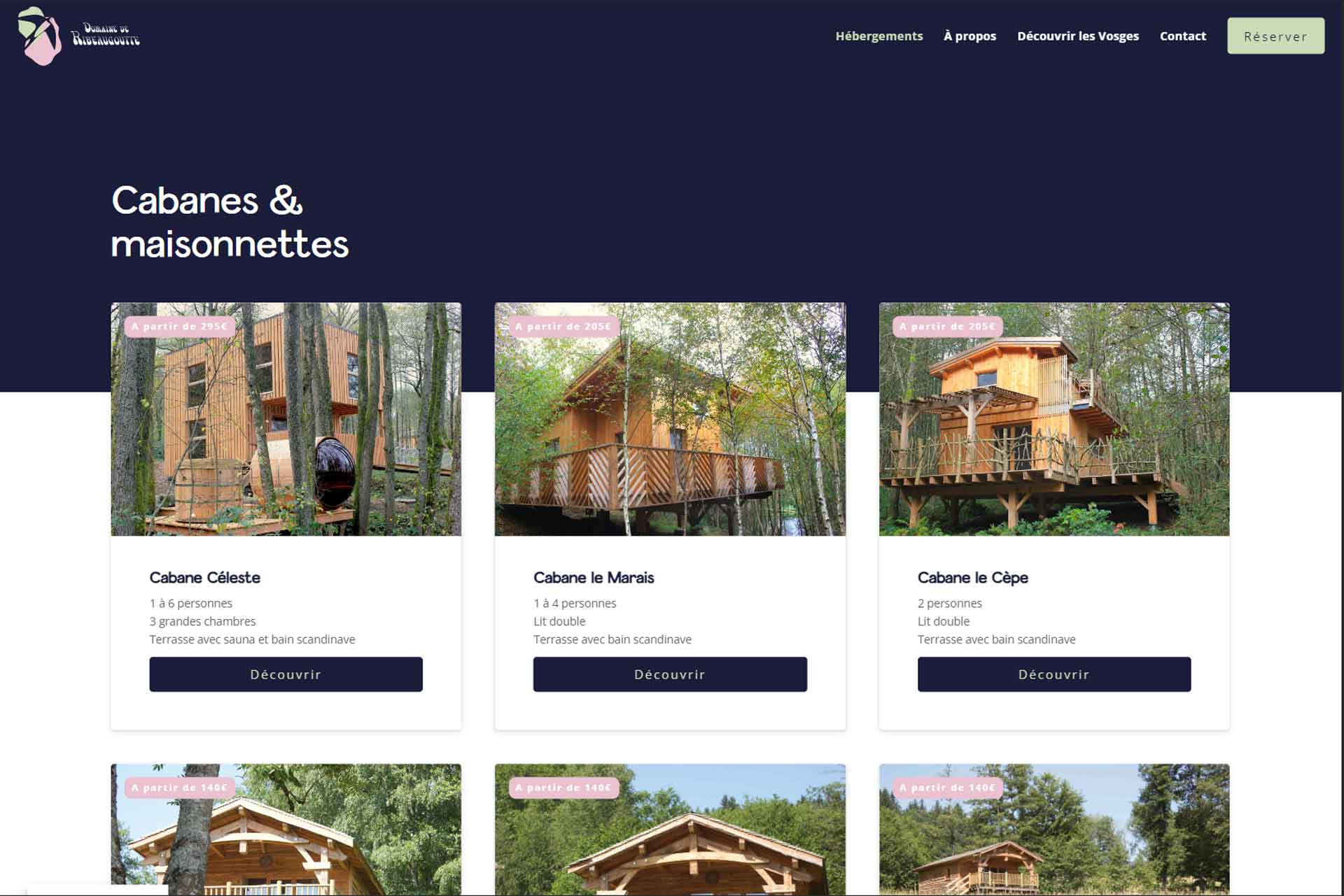 Le site du Domaine de Ribeaugoutte présente les différentes cabanes et maisonnettes disponibles à la location, ainsi que les activités et les services proposés sur place. Nous avons veillé à mettre en avant les caractéristiques uniques de chaque hébergement, tout en capturant l’essence de la nature environnante.