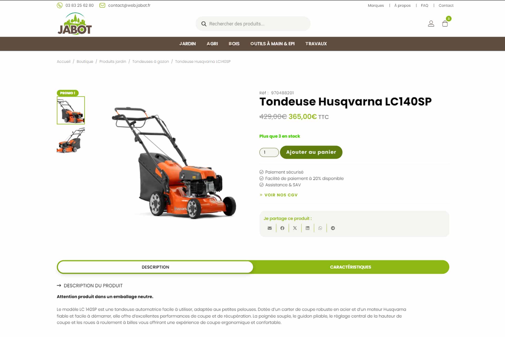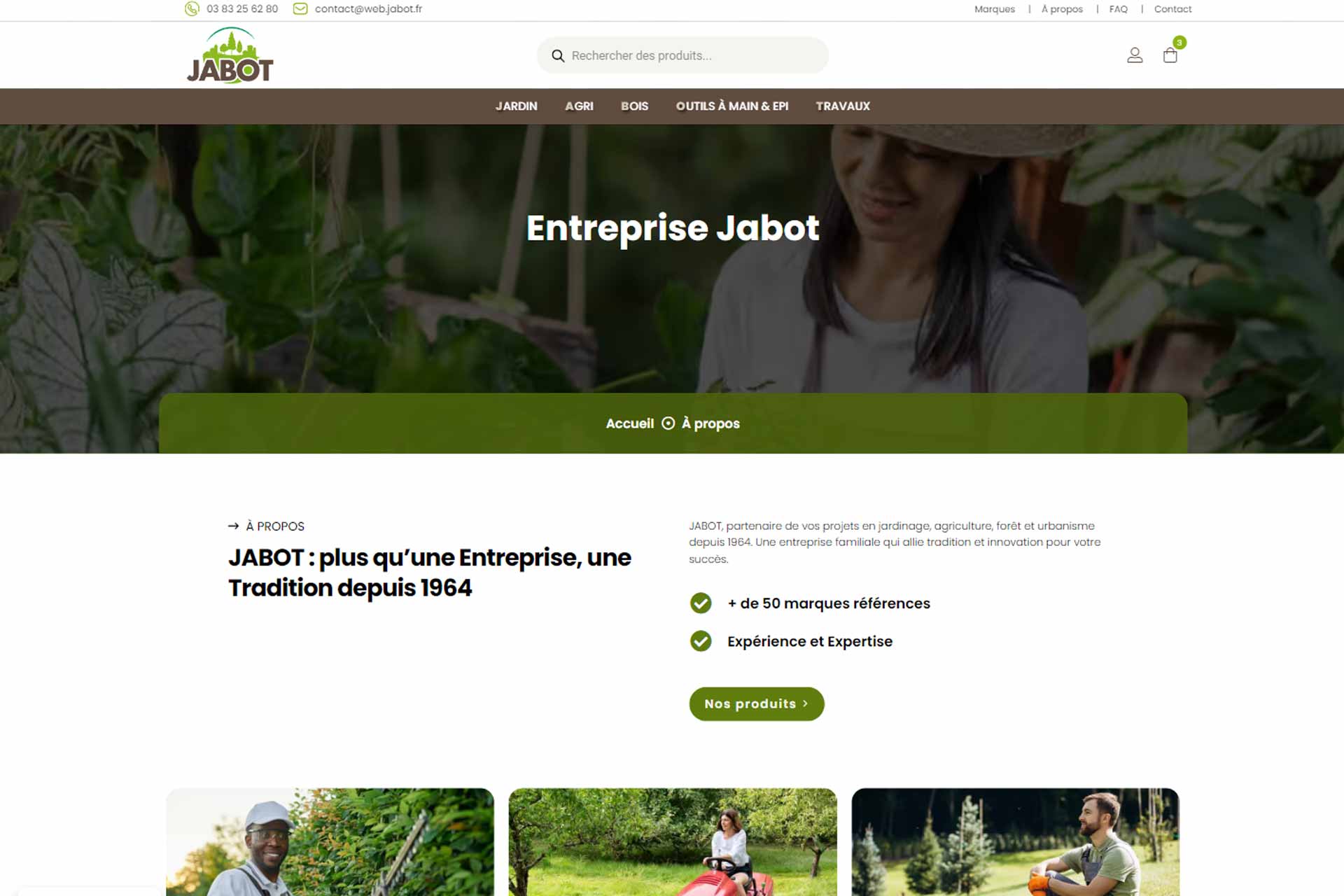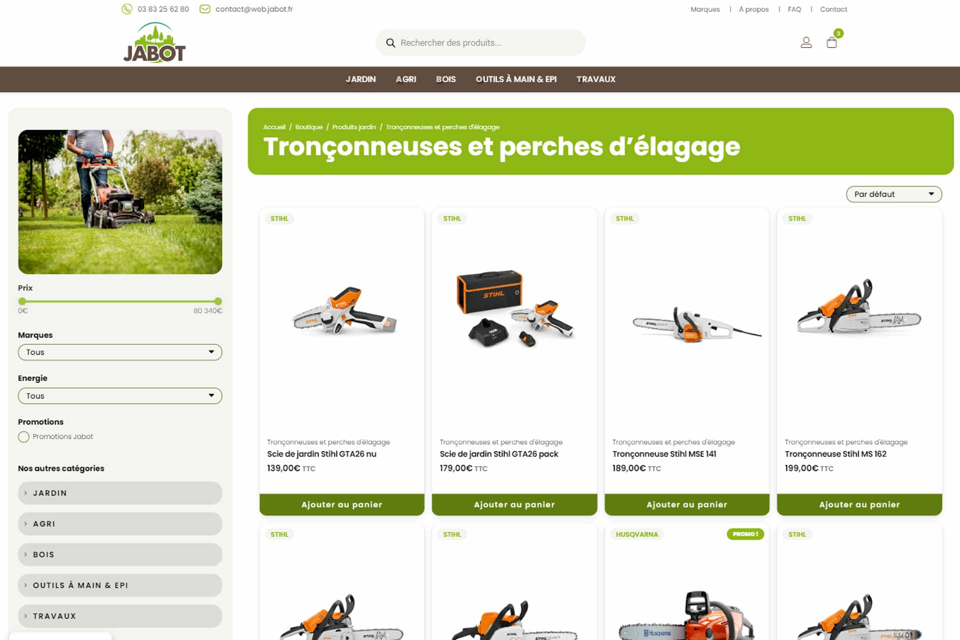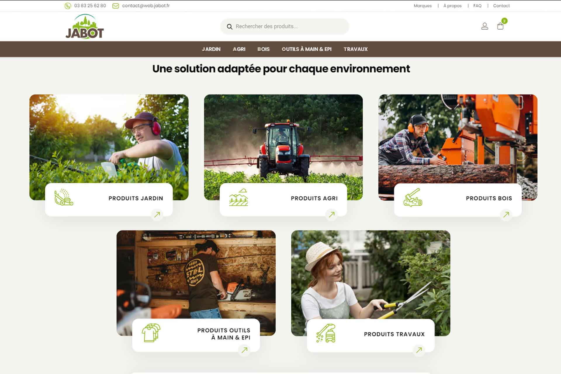 Nous sommes fiers d’avoir conçu le site marchand de Jabot, une plateforme e-commerce dédiée à la vente de matériel de motoculture. Chez Jabot, vous découvrirez une large sélection de produits allant des tondeuses et tronçonneuses de haute performance aux équipements de jardinage innovants.
